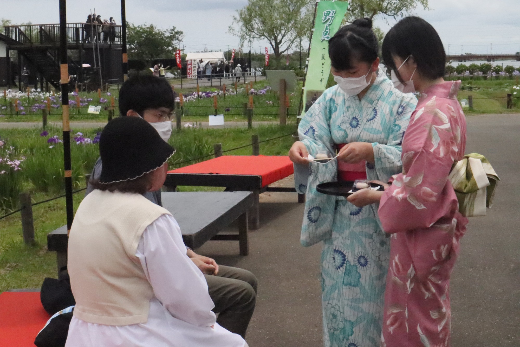 2022年6月11日、本校の茶道部があやめパーク(香取市)でのあやめ祭りを盛り上げようと、野点で観光客をもてなしました。感染状況も全国的に落ち着いている影響で、ちょうど見頃をむかえたあやめを楽しもうと多くの観光客で賑わいました。嫁入り船での結婚式イベントと並ん