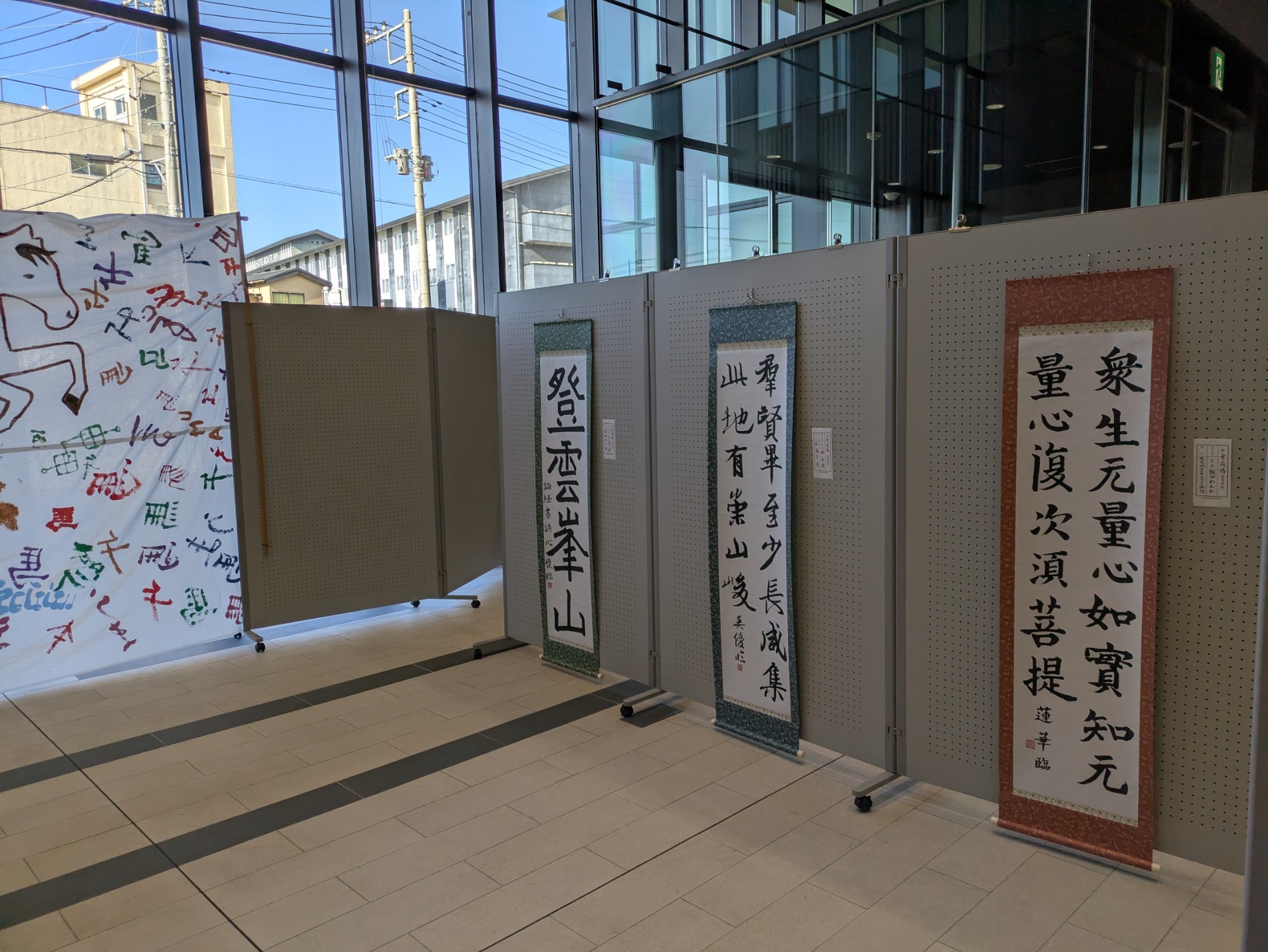 2025年12月24日から2026年1月12日までJR佐原駅近くの「みんなの賑わい交流コンパス」にて、香取郡市高等学校書道展が開催されています。主催は香取郡市高等学校書道展実行委員会で、参加校は、小見川、佐原、佐原白楊、多古、千葉萌陽高校で、各学校とともに本校の書道部、ならびに顧問である中村先生の作品も展示されています。コンパスのロビーには各校の個人作品がならび、新春のお祝いに彩りを添えています。また、午年にちなんだ共同製作の寄せ書きも展示されています。お近くにお寄りの際は、ぜひご覧ください。